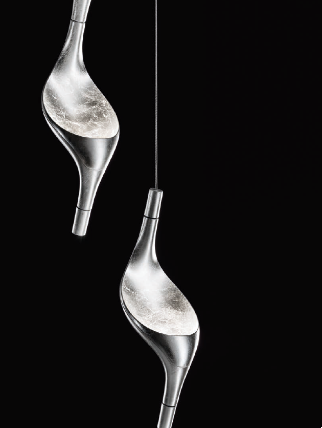 Deze zilverkleurige pendelarmatuur is vervaardigd uit gegoten aluminium, levert indirecte verlichting (uplight) en kan worden gecombineerd met andere armaturen en accessoires om eindeloze composities te creëren.