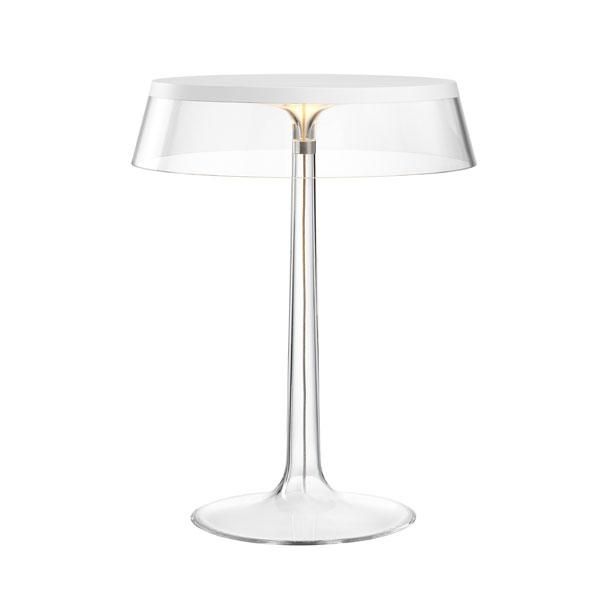 Tafellamp vervaardigd uit doorzichtige kunstof en afgewerkt in het wit. Lampenkap niet inbegrepen.