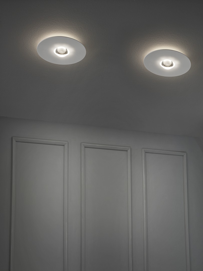 Elegante, cirkelvormige plafondarmatuur. Deze armatuur heeft een metalen structuur afgewerkt in chroom en een diffuser vervaardigd uit plexiglas. Bulgia Single levert beide direct en indirect licht.