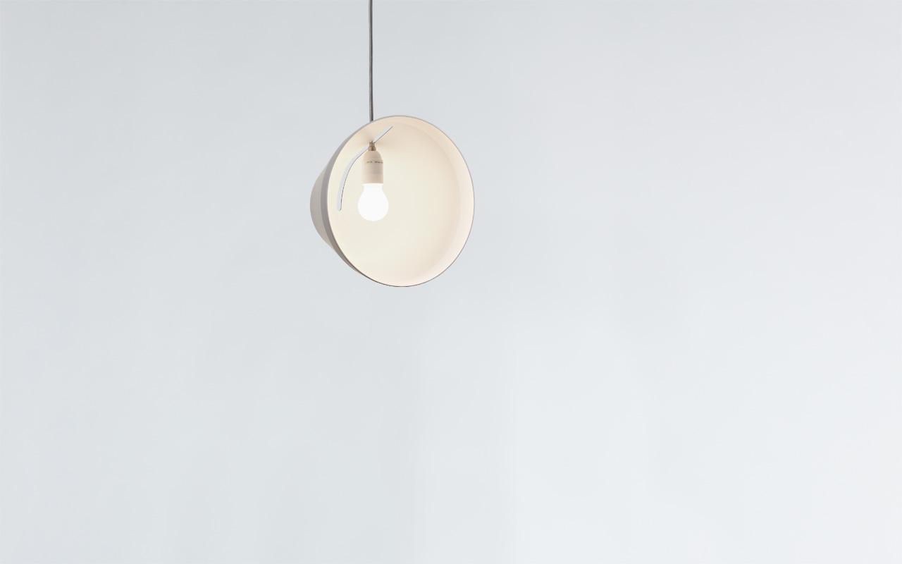 Lampenkap in mat grijs gelakt aluminium (binnenzijde in mat wit) en baldakijn uit grijze kunststof.