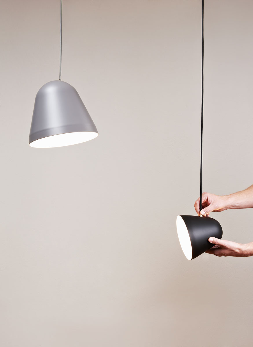 Lampenkap in mat zwart gelakt aluminium (binnenzijde in mat wit) en baldakijn uit zwarte kunststof.