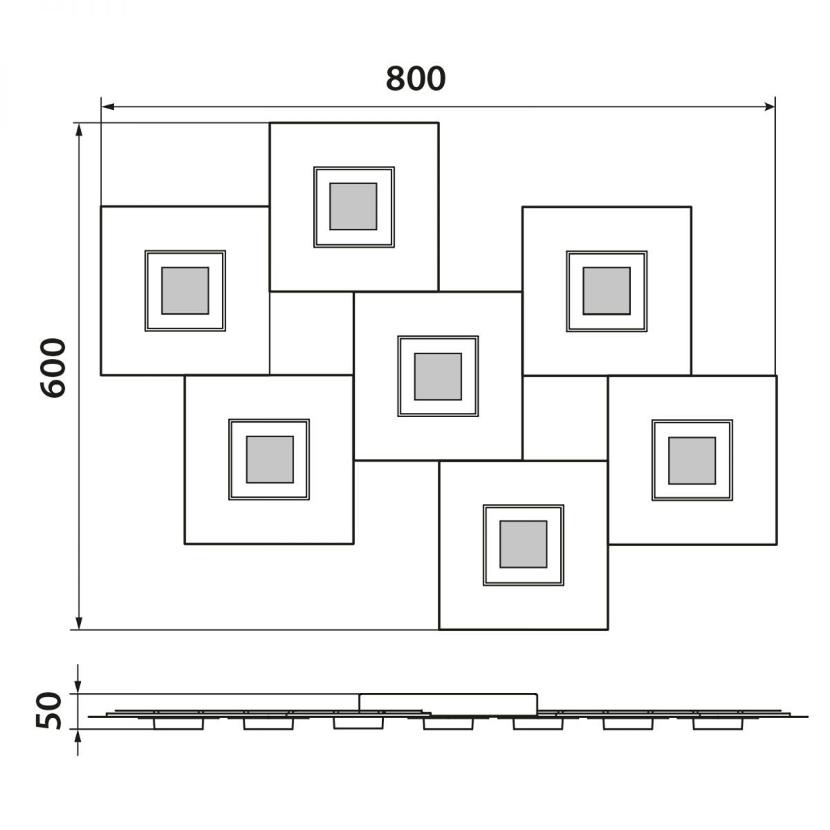 Plafondarmatuur bestaande uit 7 vierkanten. Deze armatuur is vervaardigd uit geborsteld aluminium met accenten in titanium. Deze armatuur heeft ook balkvormige diffusers uit methylacrylaat.