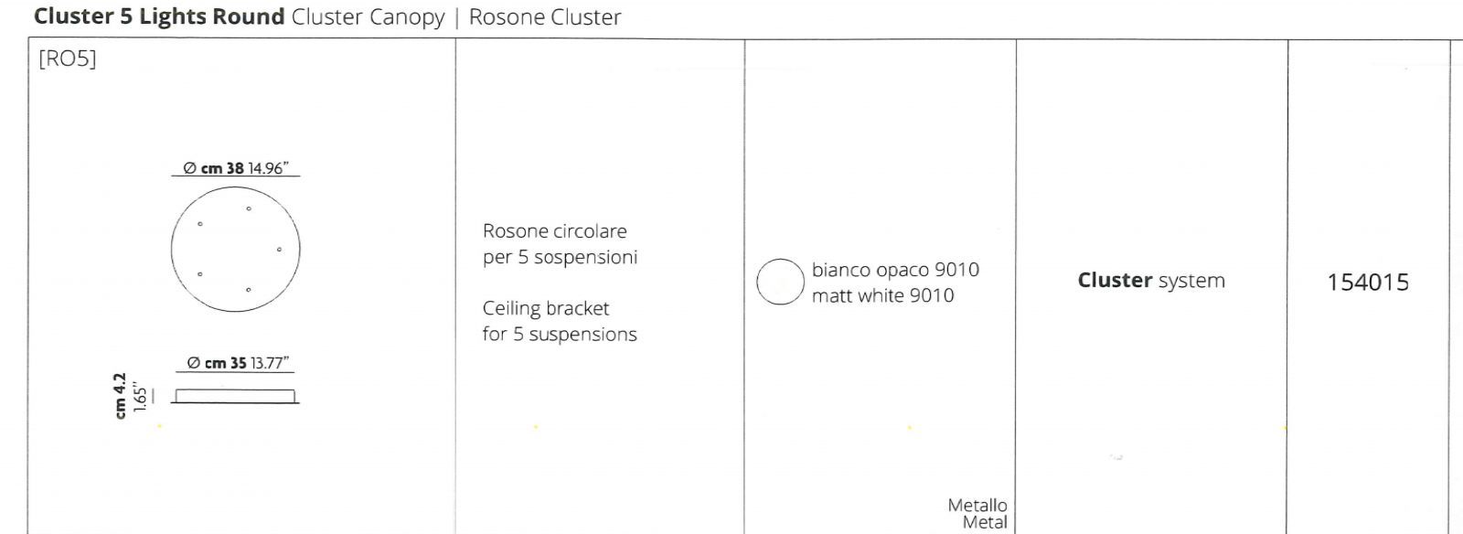 Ronde plafondbevestiging voor de compositie van 5 pendels.