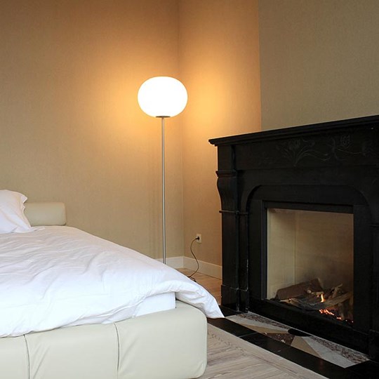 Staanlamp vervaardigd uit handgeblazen opaal glas, met een zilveren basis vervaardigd uit staal en een gegoten zilveren aluminium stang.