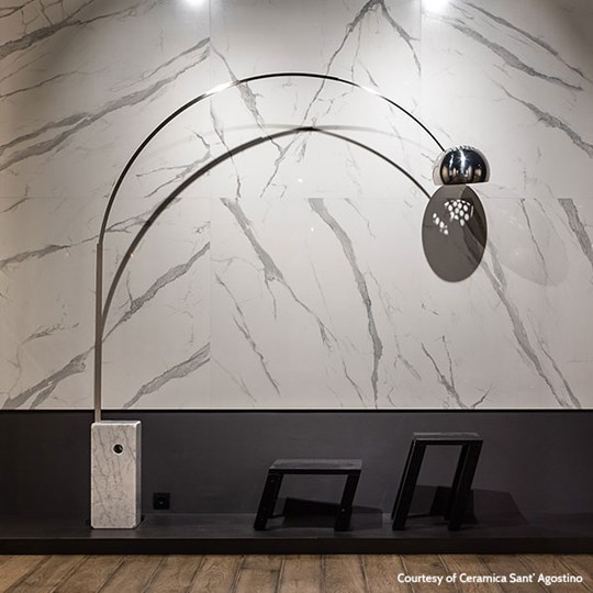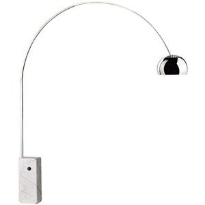 Staande lamp met marmeren voet als tegengewicht en boog bestaande uit 3 roestvrije stalen segmenten.