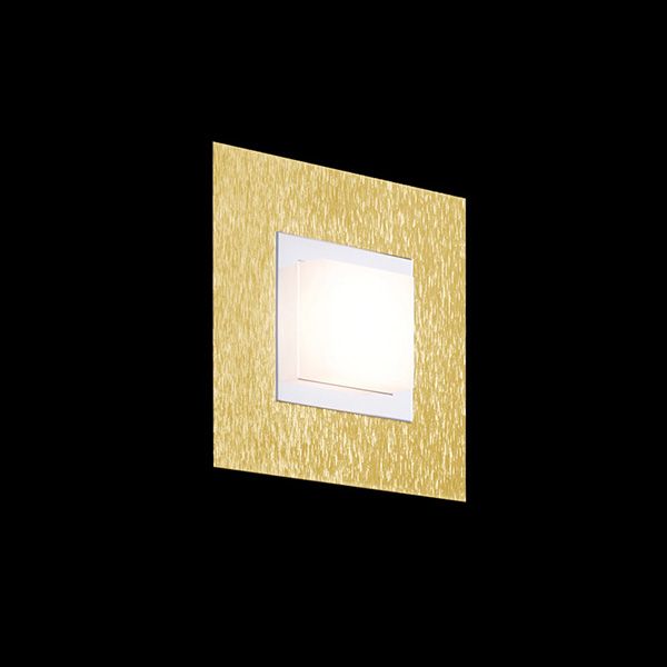 Vierkante wand-plafondarmatuur vervaardigd uit geborsteld aluminium. Deze armatuur heeft ook een satijn witte balkvormige diffuser uit methylacrylaat en is afgewerkt in messing.