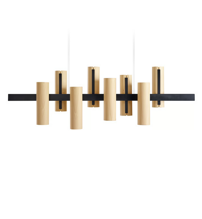 Black Note Keys Suspension, ontworpen door Ramón Esteve, is geïnspireerd op de zwarte pianotoetsen. Acht verticale kappen van houtfineer vormen samen met een slanke metalen structuur een krachtig en elegant silhouet. Verkrijgbaar in Natural Cherry, Ivory White of Natural Beech, met metalen afwerking in matzwart of goud.