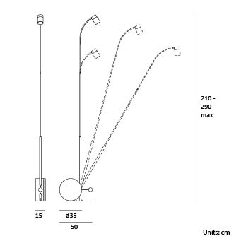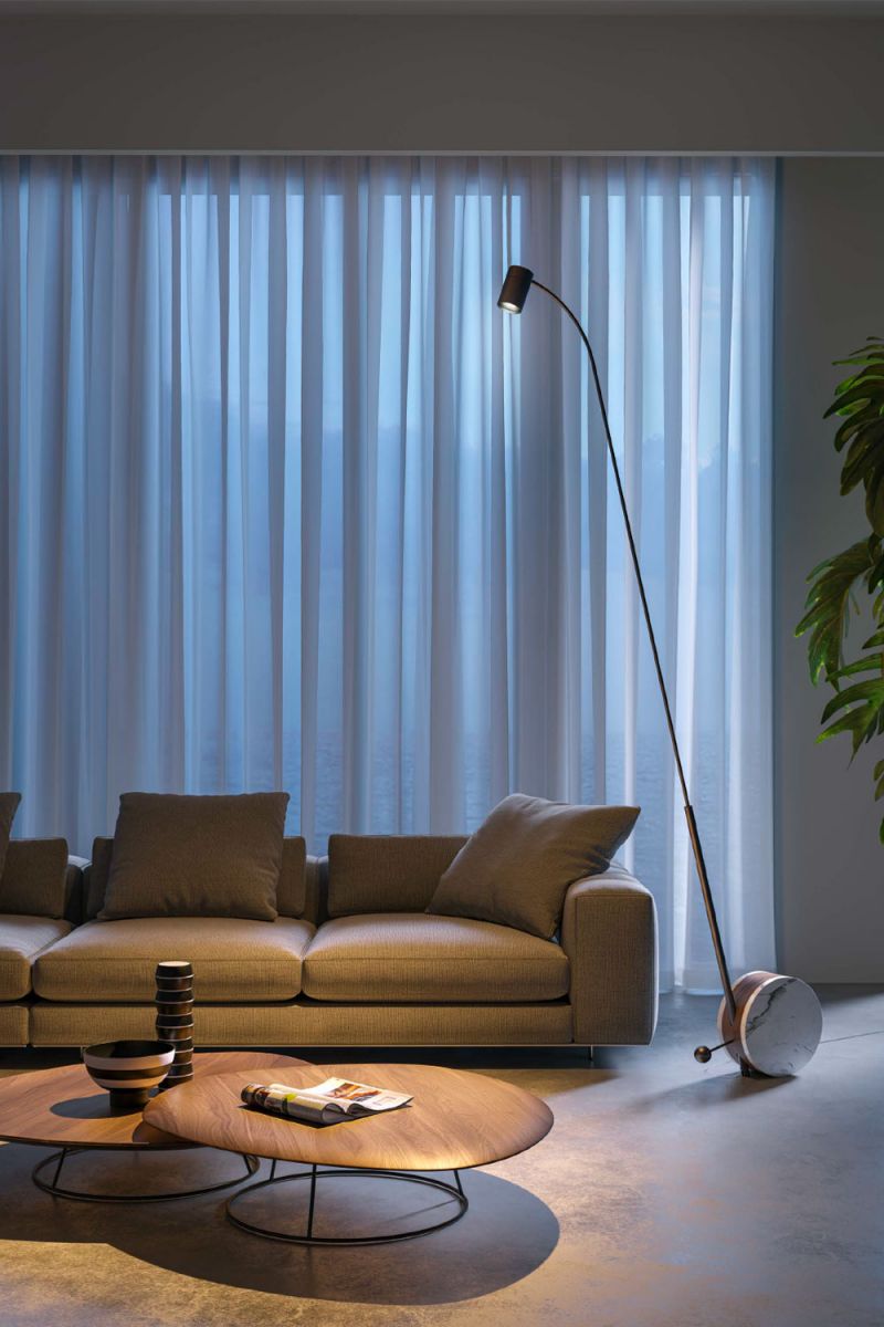Vloerlamp van metaal, hout en marmer, met een telescopische stang die via een sleutel op de voet in hoek verstelbaar is. Dankzij een geïntegreerd scharnier is de LED-spot verticaal draaibaar. Voorzien van ingebouwde LED-lichtbronnen en een voetschakelaar met dimmer. Verkrijgbaar in zwart ft en wit ft, met een ronde voet van Canaletto-notenhout en wieltjes van Carrara-wit marmer.