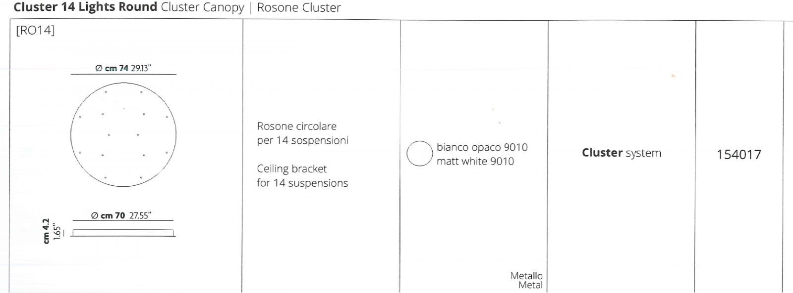 Ronde plafondbevestiging voor de compositie van 14 pendels.