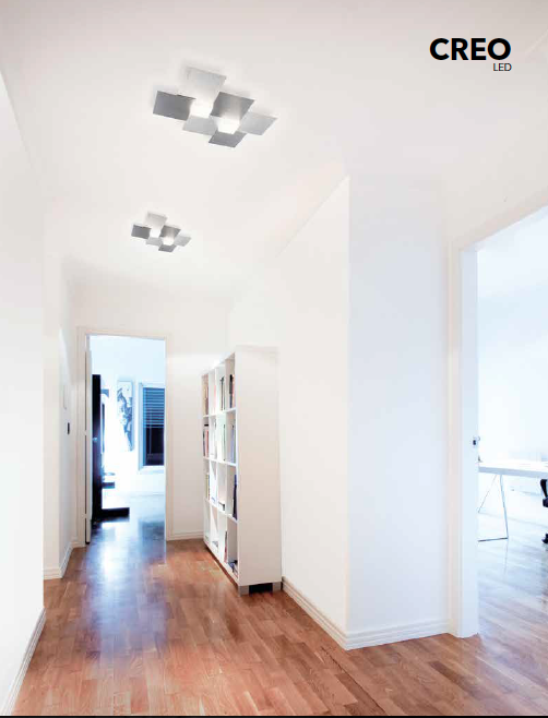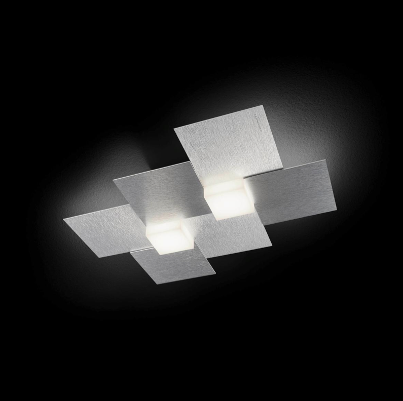 Deze plafondarmatuur bestaat uit totaal 6 geborstelde aluminium platen en 2 satijn witte balkvormige diffusers uit methylacrylaat. Deze zijn in een specifieke volgorde op elkaar gerangschikt en wisselen elkaar af in de expressie van de snijrichting - soms horizontaal, soms verticaal.