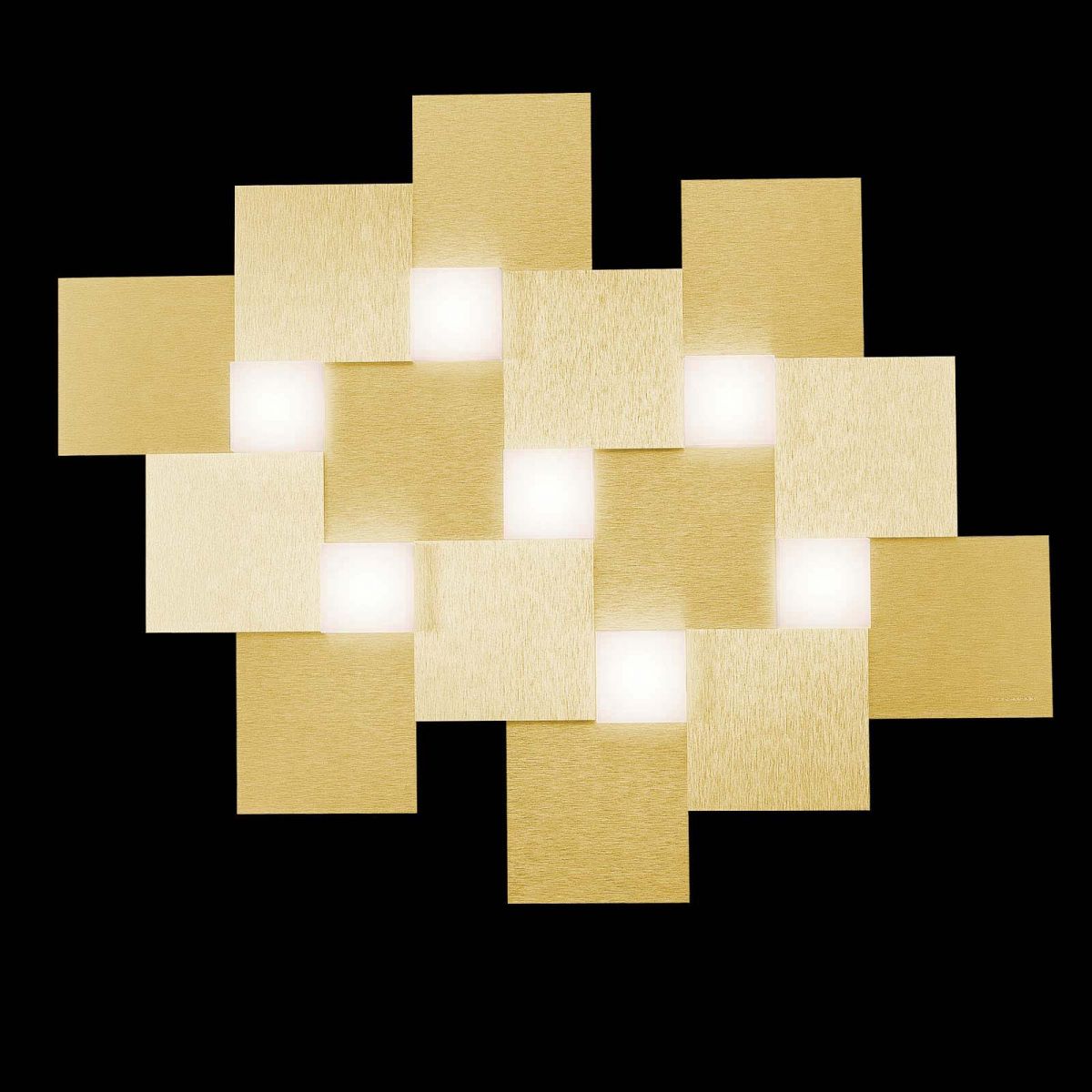 Deze plafondarmatuur bestaat uit totaal 14 geborstelde aluminium platen, afgewerkt in mat messing en 7 satijn witte balkvormige diffusers uit methylacrylaat. Deze zijn in een specifieke volgorde op elkaar gerangschikt en wisselen elkaar af in de expressie van de snijrichting - soms horizontaal, soms verticaal.