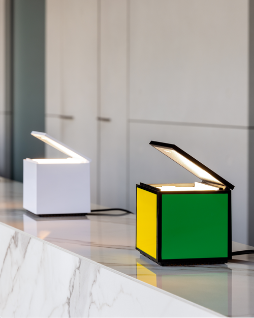 Cuboluce: open en het licht gaat aan, sluit en het gaat uit. De tijdloze lamp uit 1972 is nu verkrijgbaar in drie versies en negen afwerkingen: Cuboluce Classic met E14-fitting, Cuboluce LED met geïntegreerde LED, en Cuboluce Wireless met geïntegreerde LED en oplaadbare lithium-ionbatterij met lange autonomie.