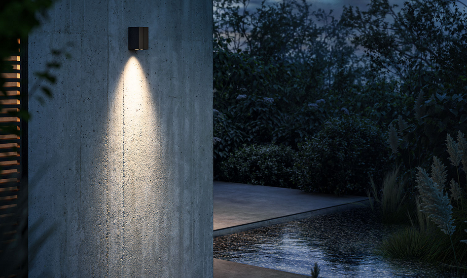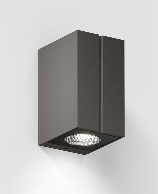 Balkvormige wandarmatuur. Deze armatuur levert enkel directe verlichting (downlight), maar kan ook als uplight gemonteerd worden. Beschikbaar in het zwart.