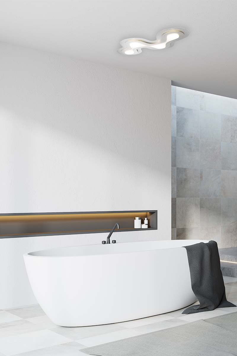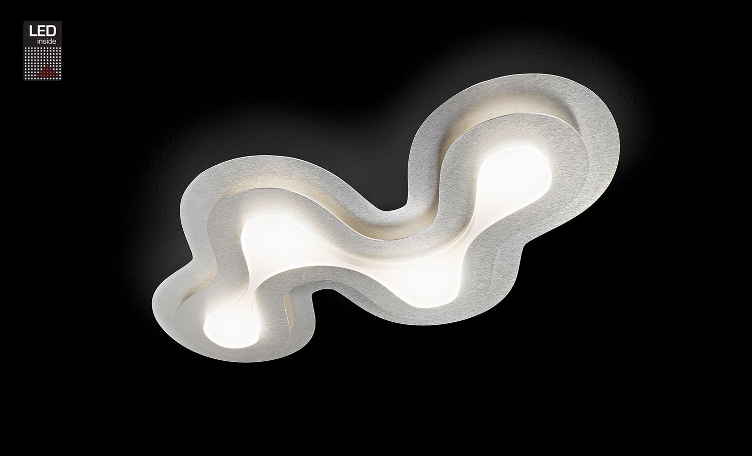 Deze armatuur heeft iets weg van een geografisch reliëf dankzij zijn golvend design. Deze armatuur is vervaardigd uit geborsteld aluminium en heeft een satijn witte diffuser.