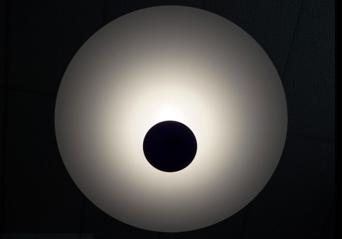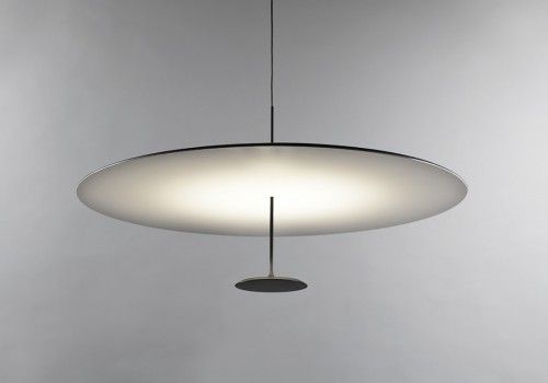 Pendelarmatuur afgewerkt in een zwarte kleur. Deze armatuur lijkt op een zwevende schijf van licht. De kleinere schijf bevat een ring van leds en het licht van deze leds wordt door het mat witte oppervlak van de 2de schijf weerkaatst.