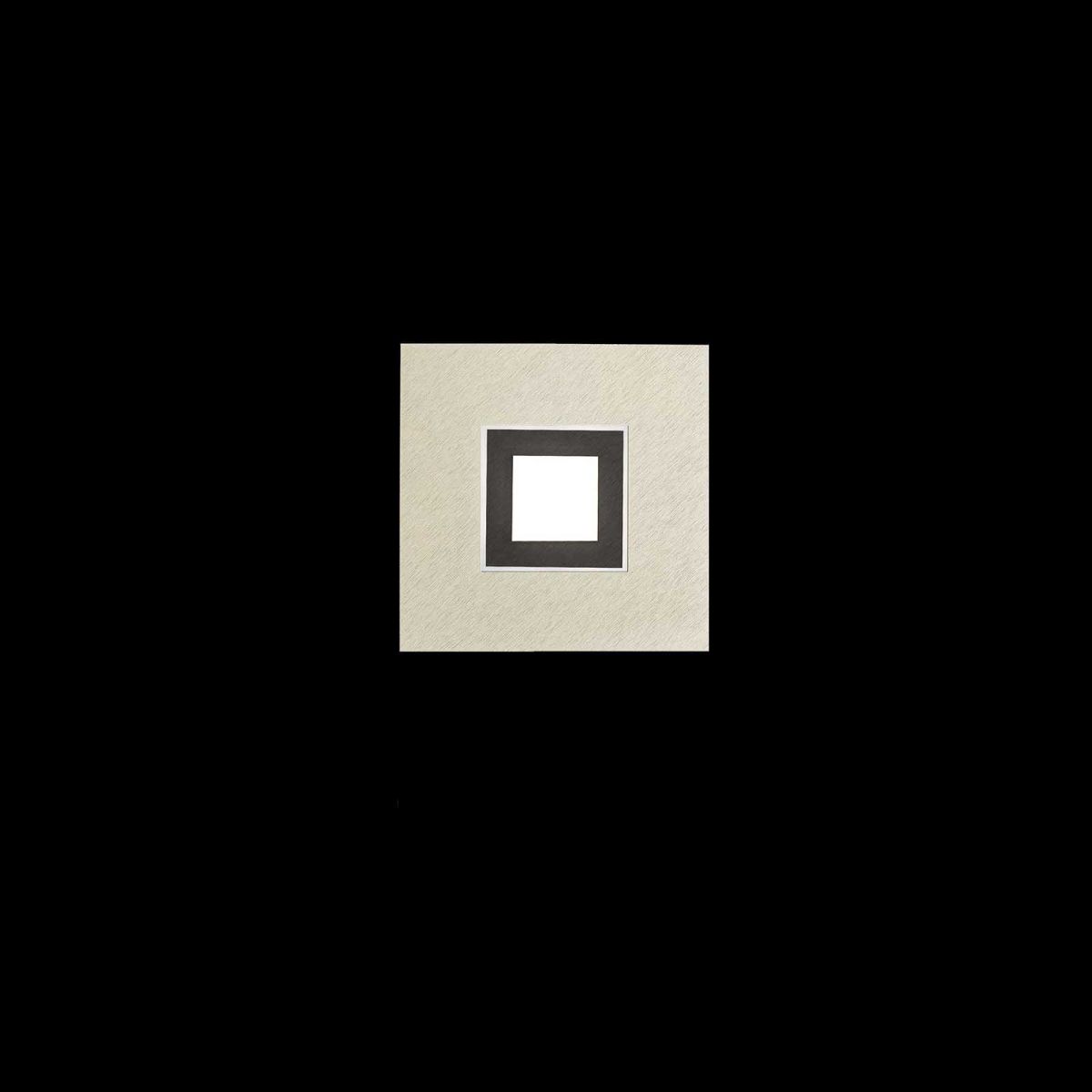Vierkante wand-plafondarmatuur vervaardigd uit geborsteld aluminium, afgewerkt in parelmoer en heeft zwarte accenten. Deze armatuur heeft ook een balkvormige diffuser uit methylacrylaat.
