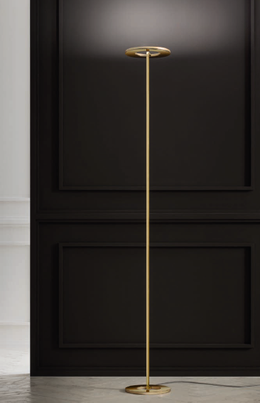 Deze staande lamp is afgewerkt in goud en bestaat uit een ring die horizontaal op een verticale staaf geplaatst is. De led is op de bovenkant van deze ring geplaatst waardoor deze indirecte verlichting levert.