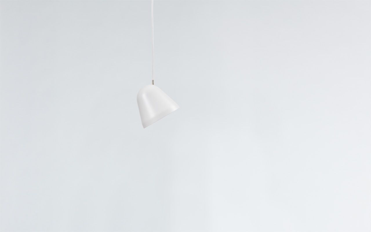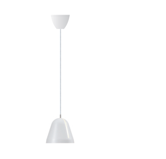 Lampenkap in mat wit gelakt aluminium en baldakijn uit witte kunststof.
