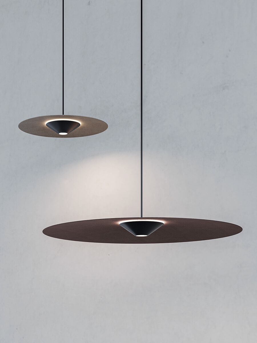 De lamp wordt gekenmerkt door een grote en tamelijk afgeplatte metalen diffuser met een conische vorm, maar met een zeer dunne dikte die de ruimte niet afsluit. De LED projecteert een puntige lichtstraal die het licht homogeen naar beneden verspreidt.
