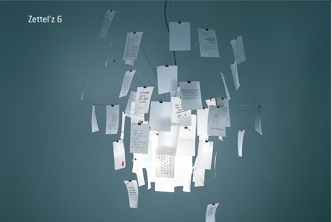 Zettel’z 6 is de kleinere versie van Zettel’z 5, uitgevoerd in roestvrij staal, hittebestendig gesatineerd glas en zeer dun, translucide Japans papier. De lamp wordt geleverd met 40 bedrukte en 40 blanco DIN A6-vellen, die naar wens kunnen worden gebruikt voor persoonlijke boodschappen of schetsen. Dankzij de E27-fitting en het ontbreken van een extra downlight kan de lamp zowel luchtig en speels als compact en strak worden ingericht, waardoor veel ruimte voor creativiteit ontstaat.